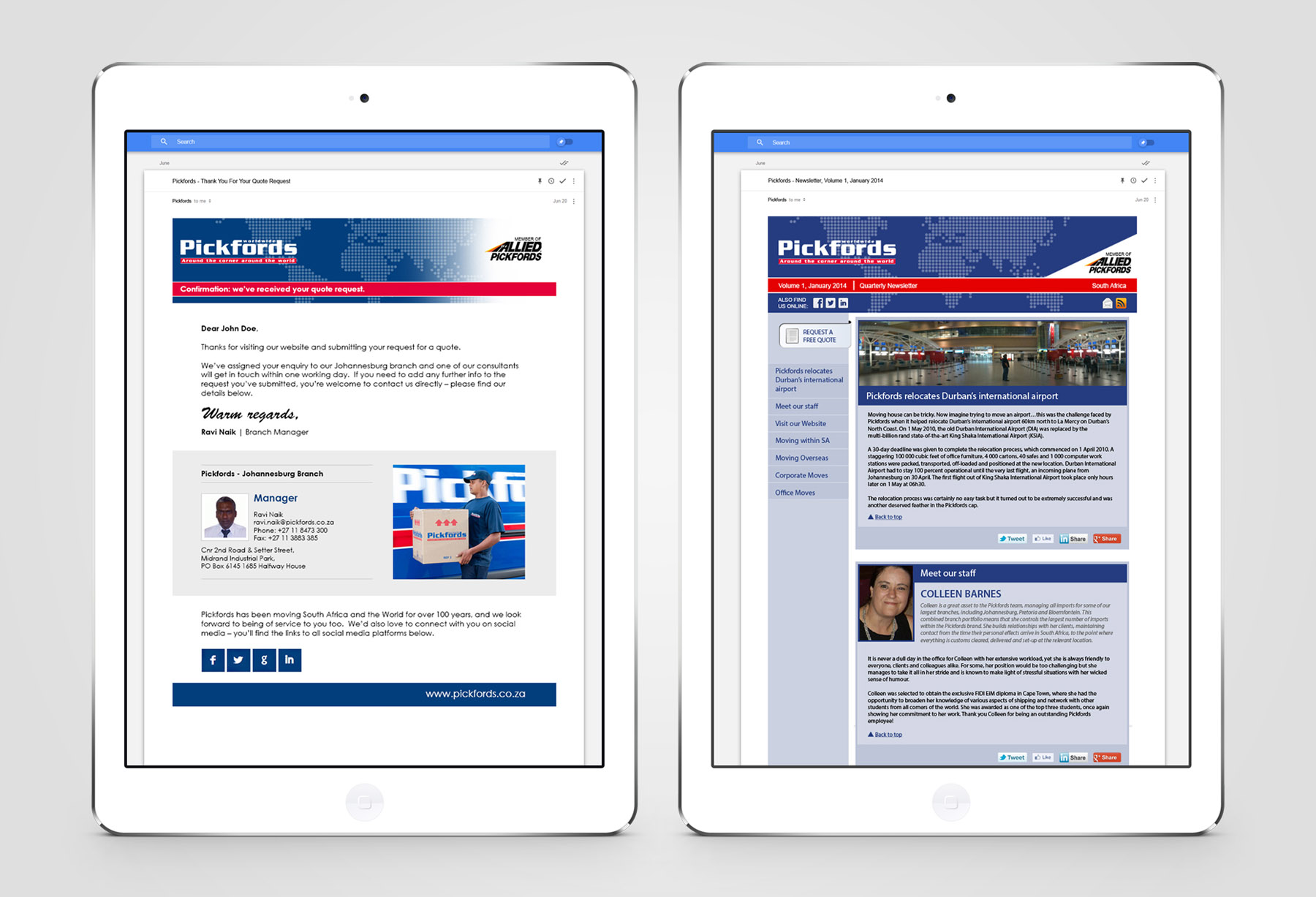 E-mail template and newsletter designed & developed for well-known South African relocations company, Pickfords.