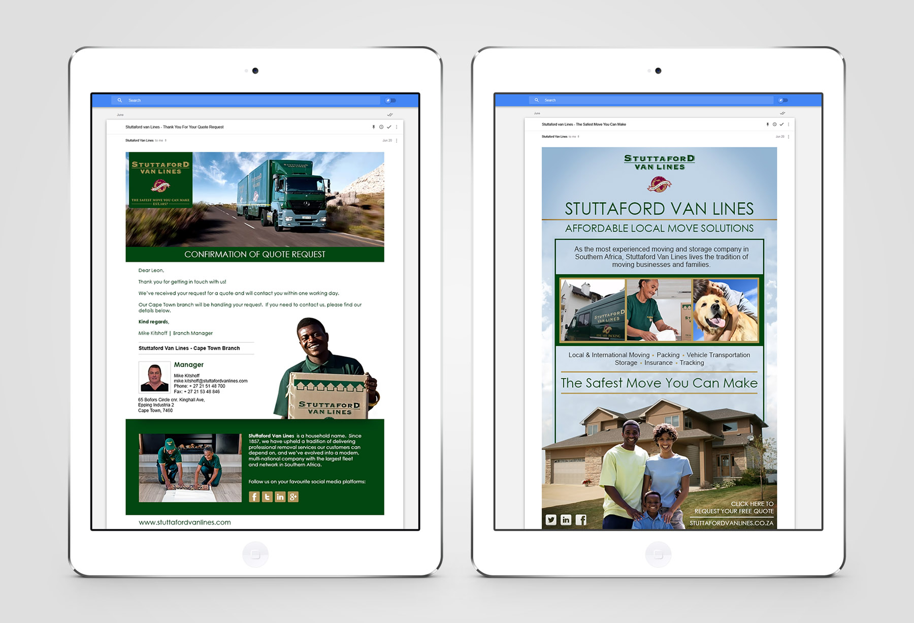 Stuttaford Van Lines – NewslettersPrevNextNewsletters and e-mail advertisements designed & developed for well-known South African relocations company, Stuttaford Van Lines. Photoshop, HTML, Copywriting, Dreamweaver301.6 K
